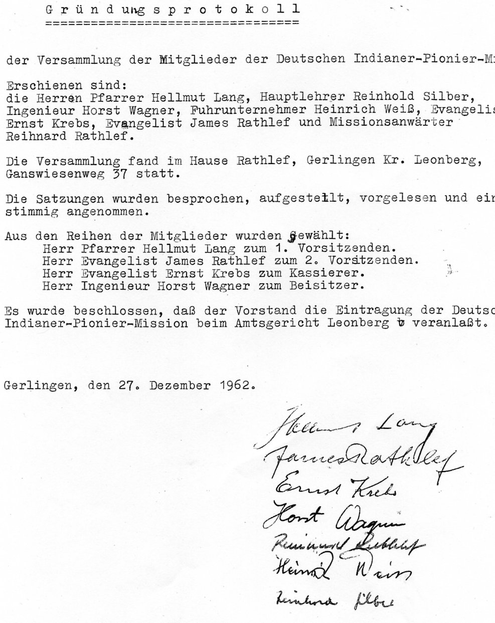 Link to the Corporate Charter which was signed in the small study of James Rathlef in Gerlingen-Gehenbühl, Ganswiesenweg 37. At the start there are 23,000 DM and a missionary. This missionary is Winfried, James Rathlef's oldest son, already busy in Brazil. Lateron many other missionaries will come. |